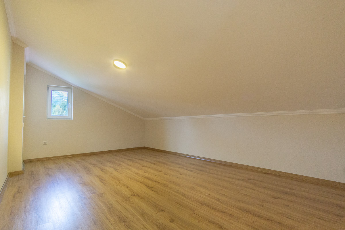 The interior design of the house, which has a net 120 m² usage area, is shaped by the warmth of solid wood details. The bright and spacious living room that greets you on the ground floor offers a peaceful environment with its fireplace. While the open-plan kitchen integrated with the living room supports a modern lifestyle; large balconies on each floor add a strong sense of spaciousness to the home.