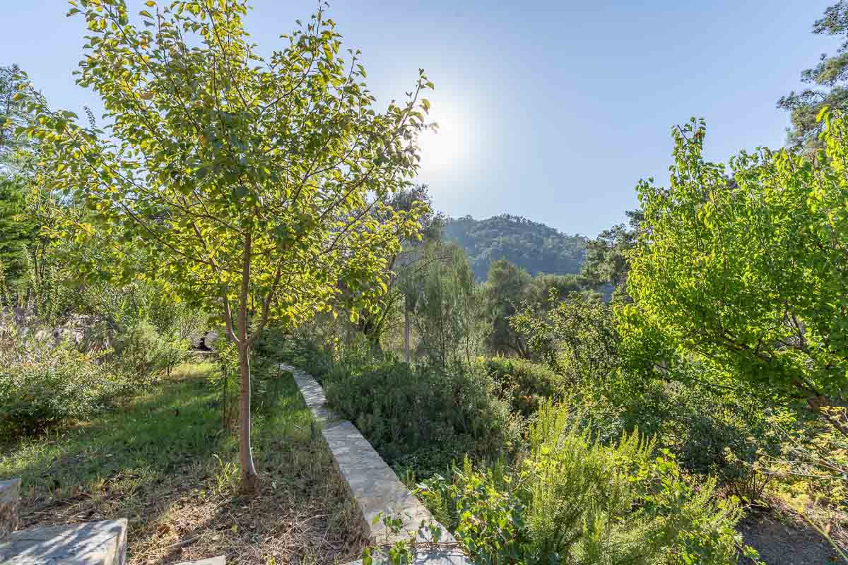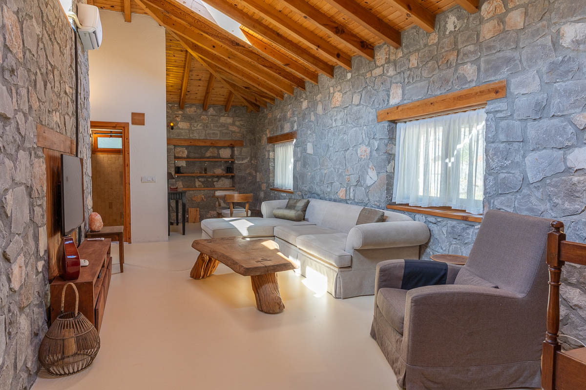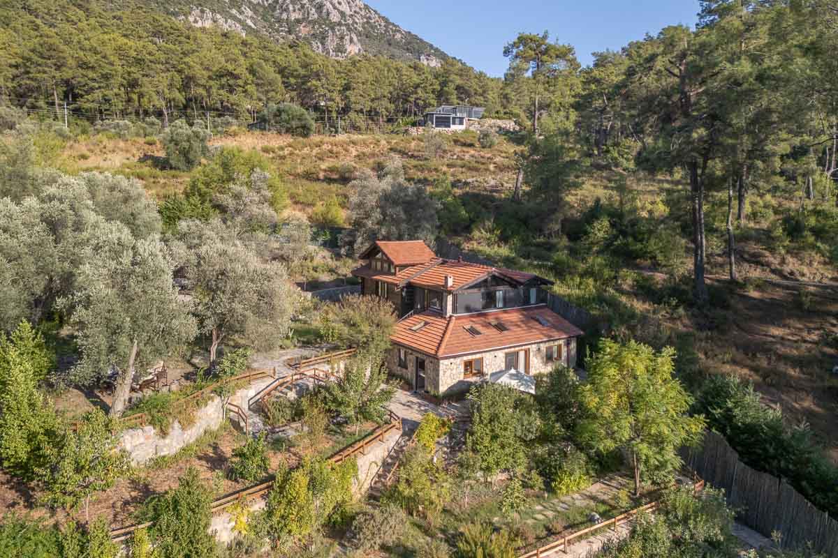 The property includes three stone houses, each positioned on different levels of the naturally sloped terrain. At the highest point stands the main residence — a 126 m² stone villa built with natural stone and wood, offering the warmth and charm of a countryside home in Gocek. Inside, it features two bedrooms, a bathroom, a mezzanine guest room, and a spacious open-plan kitchen with panoramic forest views. High ceilings and a large terrace overlooking the treetops create a welcoming atmosphere for year-round living.
