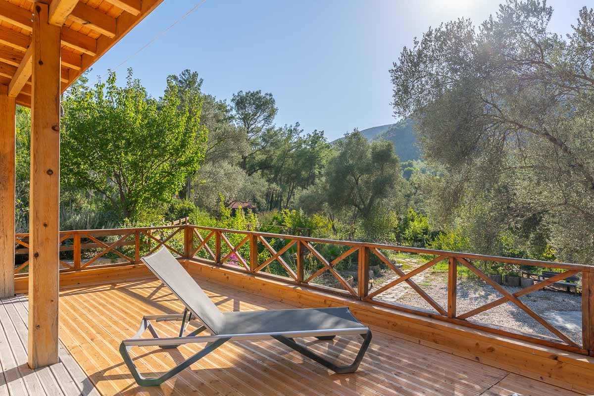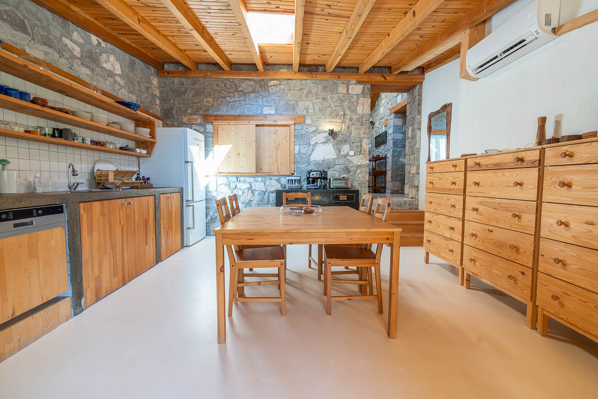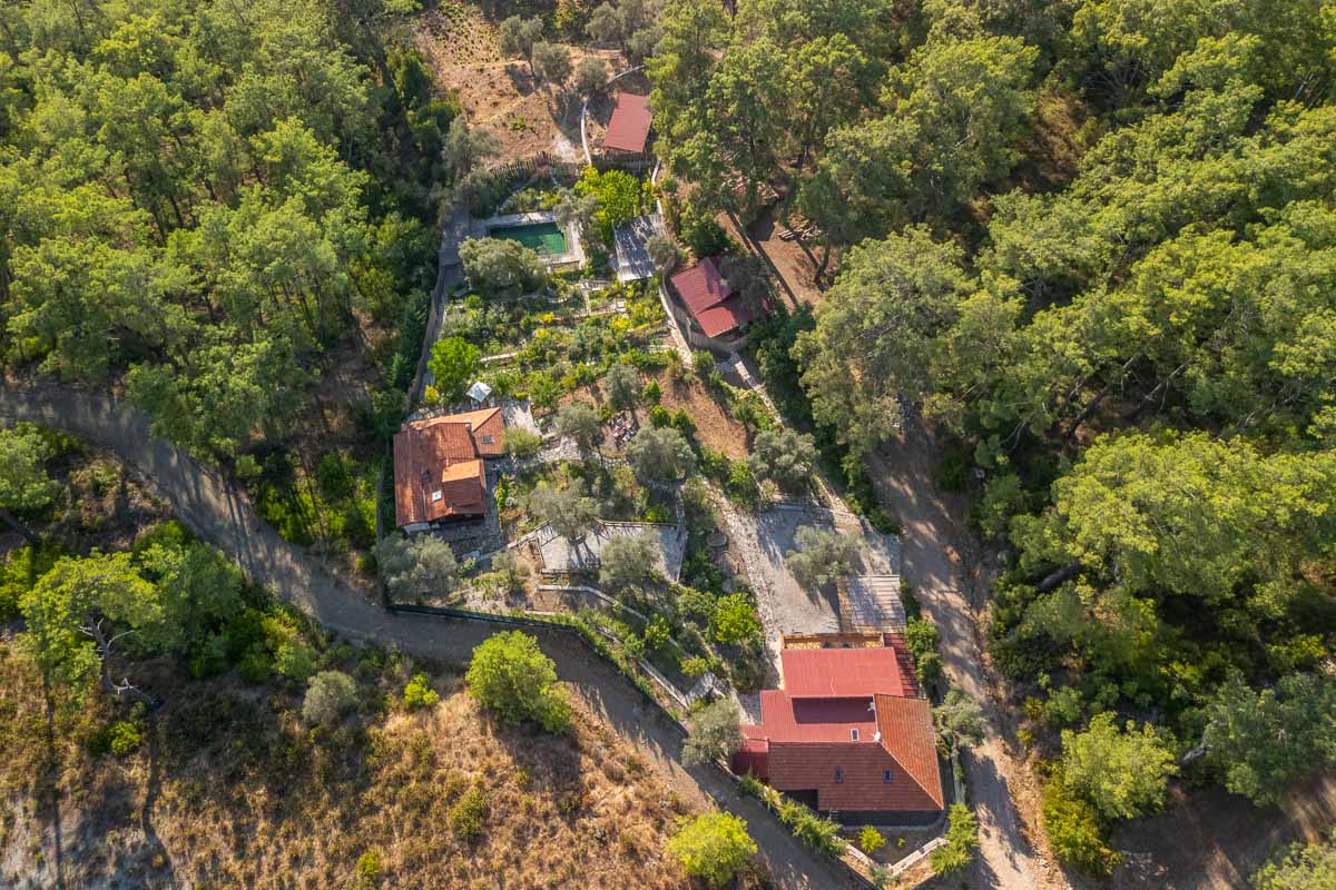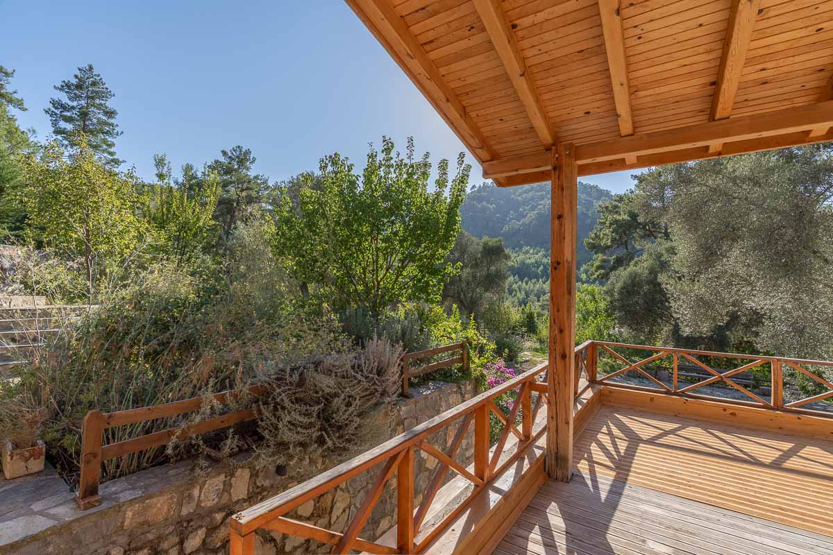 The property includes three stone houses, each positioned on different levels of the naturally sloped terrain. At the highest point stands the main residence — a 126 m² stone villa built with natural stone and wood, offering the warmth and charm of a countryside home in Gocek. Inside, it features two bedrooms, a bathroom, a mezzanine guest room, and a spacious open-plan kitchen with panoramic forest views. High ceilings and a large terrace overlooking the treetops create a welcoming atmosphere for year-round living.