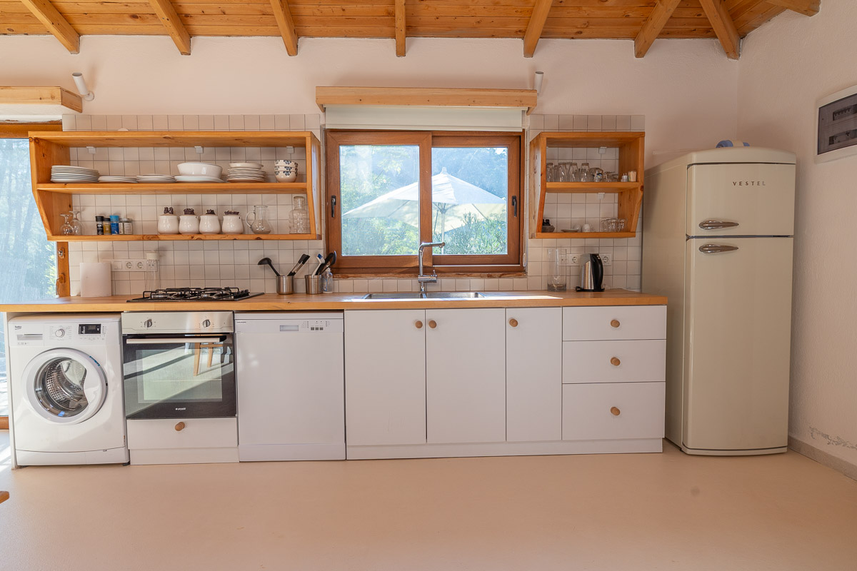 Just below the main house is the second building, divided into two units. The lower level serves as a private guesthouse with a bedroom, bathroom, and kitchen. The upper level includes two bedrooms, a mezzanine sleeping area, a large living room, and a fully equipped kitchen — ideal for hosting family or friends.