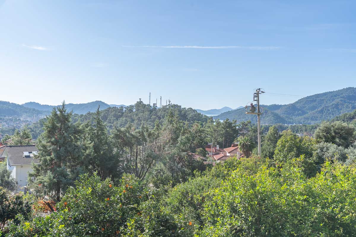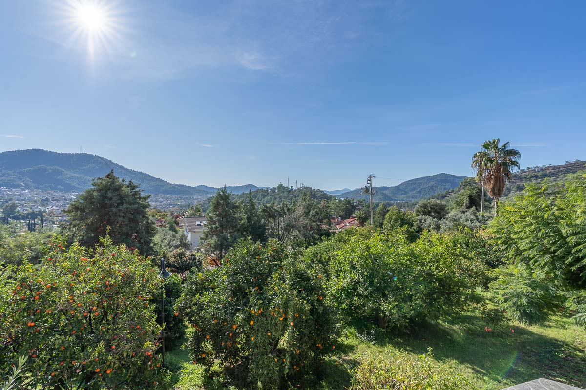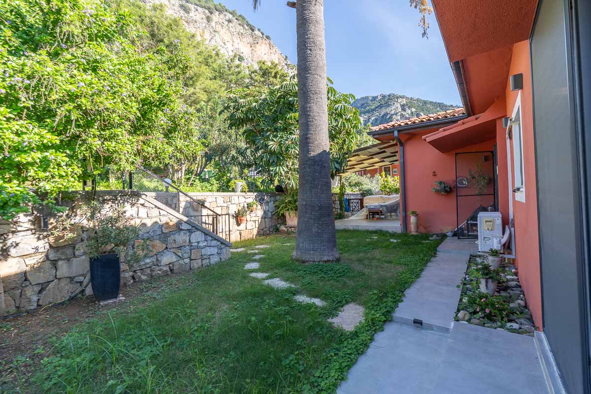 Located in one of Göcek’s most natural and tranquil residential areas, this renovated semi-detached villa sits in Kalimche Site — a well-known community surrounded by pine forests, natural vegetation and walking paths. Positioned just below the communal swimming pool, the villa enjoys an open, airy setting with a beautiful view over a mature orange grove.