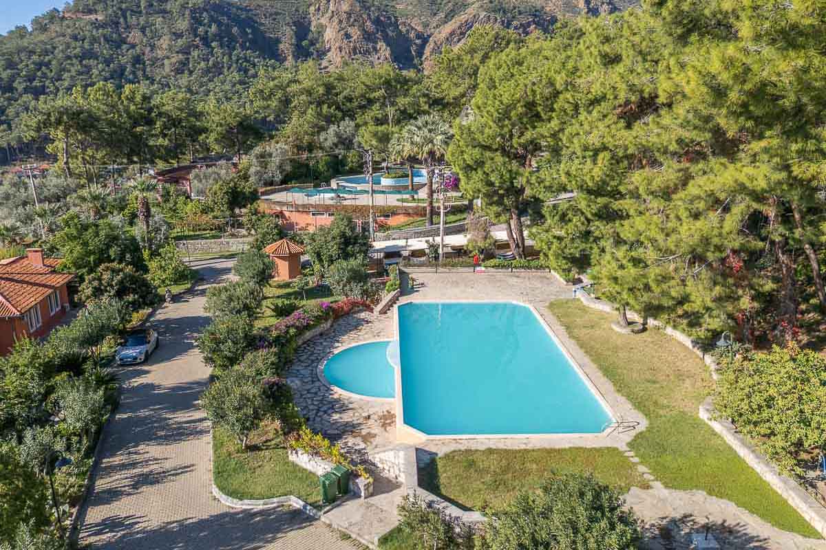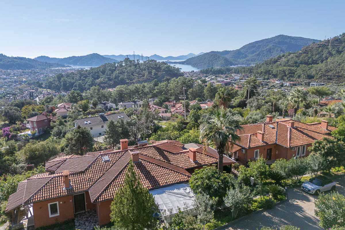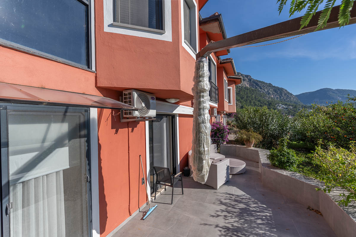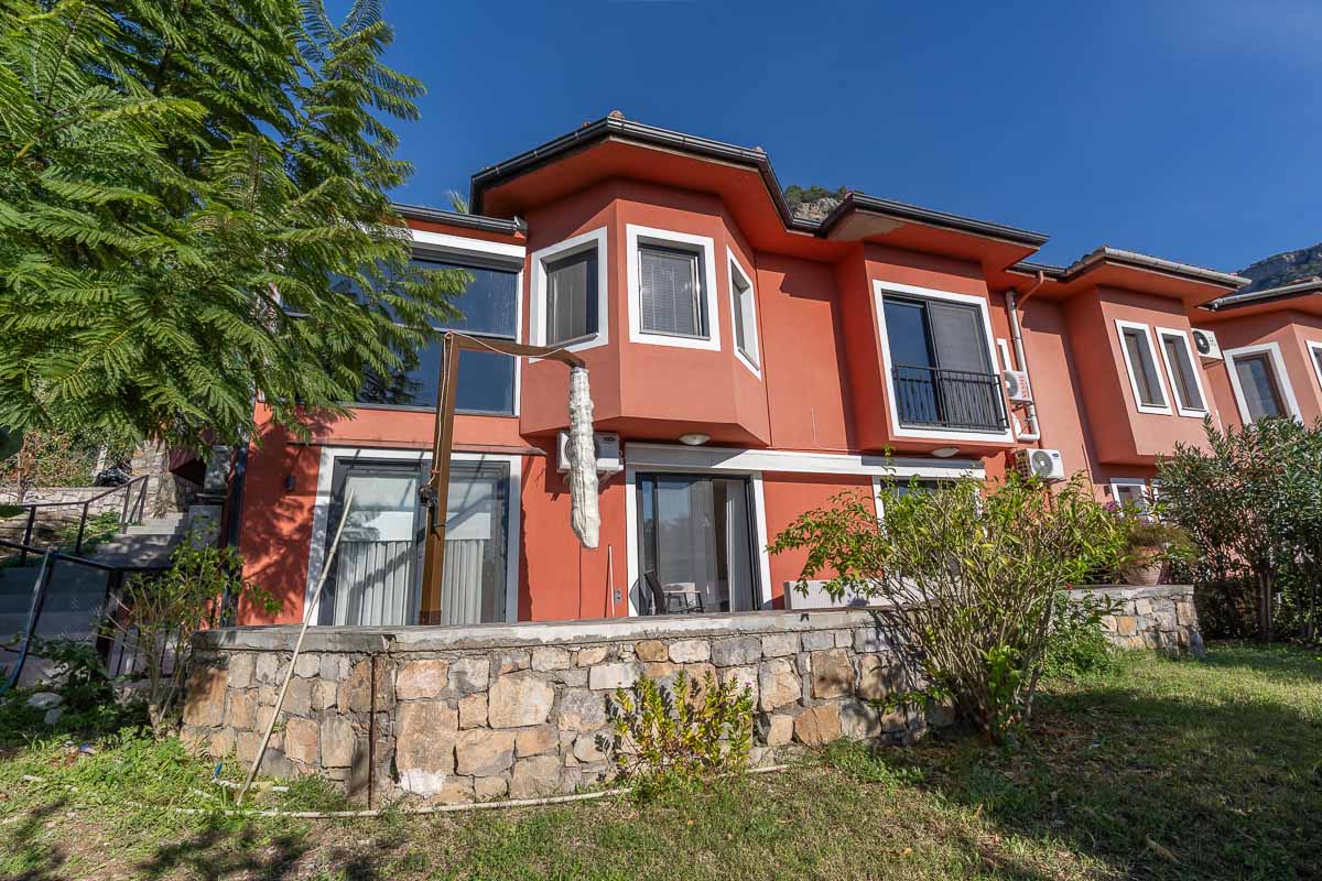 Located in one of Göcek’s most natural and tranquil residential areas, this renovated semi-detached villa sits in Kalimche Site — a well-known community surrounded by pine forests, natural vegetation and walking paths. Positioned just below the communal swimming pool, the villa enjoys an open, airy setting with a beautiful view over a mature orange grove.