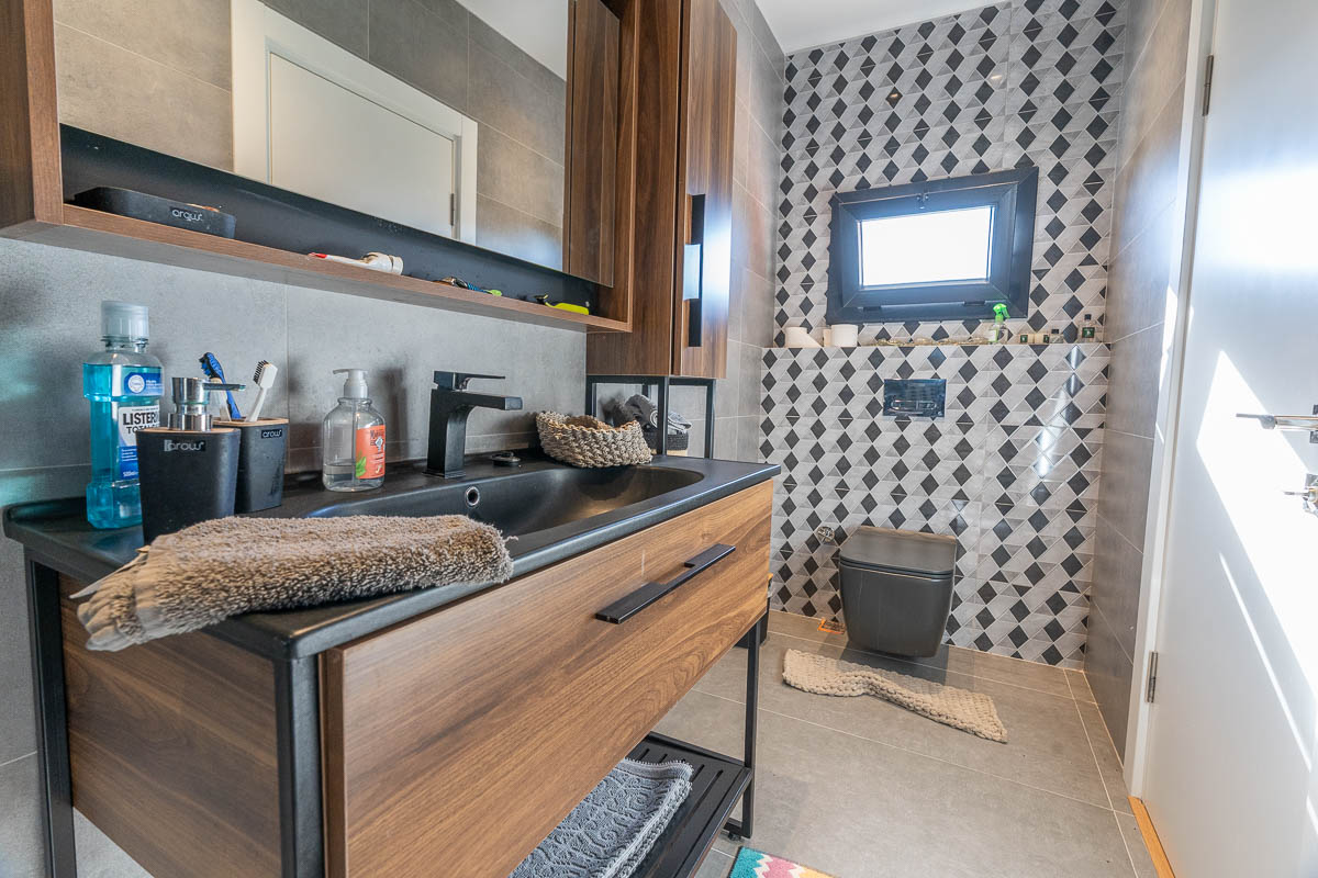 The lower level includes two additional bedrooms, both with en-suite bathrooms, providing privacy for guests or family members. A separate staff/guest room with its own bathroom is also located on this floor. From this level, you can step out to a wide terrace that connects directly to the orange grove below — a serene outdoor setting ideal for quiet mornings or shaded afternoons.
