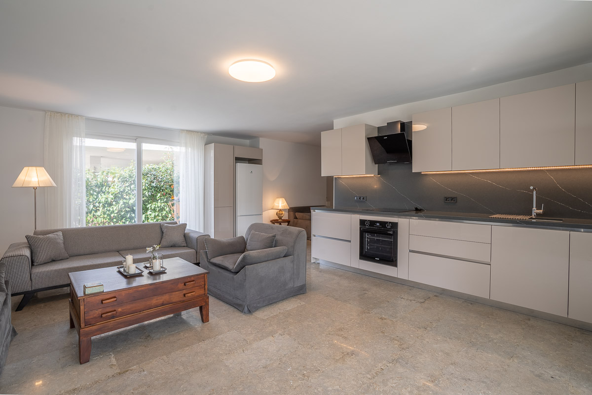 Natural materials, Mediterranean tones, and elegant finishes give this apartment a warm yet sophisticated atmosphere. It’s equipped with a fan-coil heating system, water heater, fiber internet, and private parking, ensuring year-round comfort.