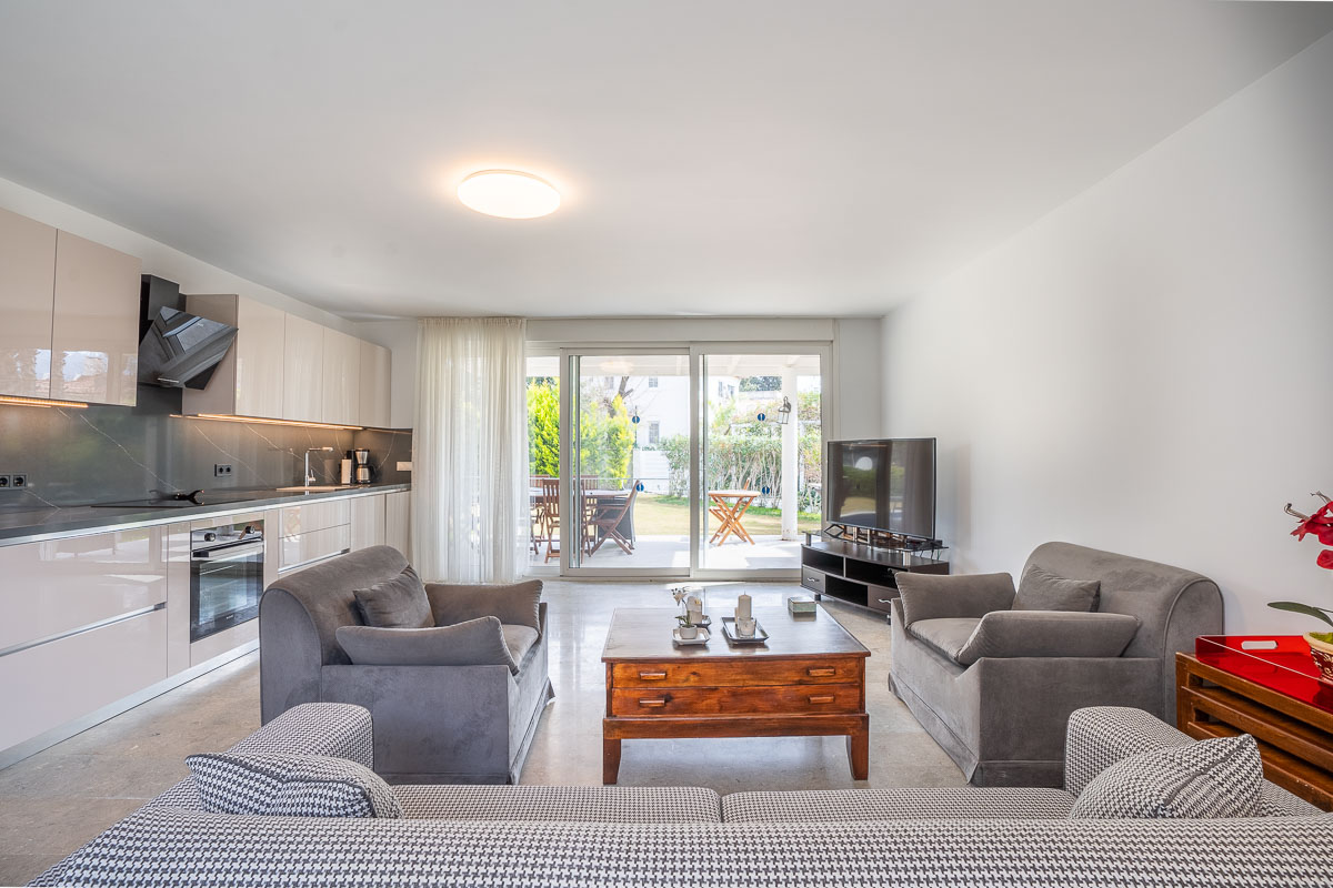 This particular corner garden apartment occupies one of the most desirable positions within the site, featuring a private swimming pool and a beautifully landscaped garden. With a net living area of 110 m² and 250 m² total plot share, the property offers spacious, single-level living — ideal for families or those who prefer easy accessibility.