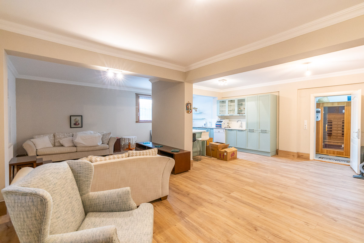 On the semi-basement level, a bright hobby room with windows and a small kitchenette provides a versatile space that can serve as a gym, studio, or additional guest area.